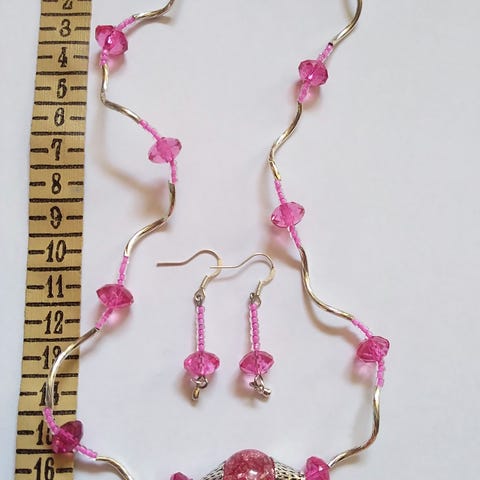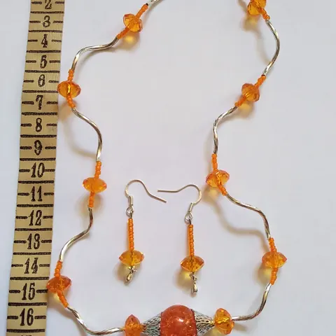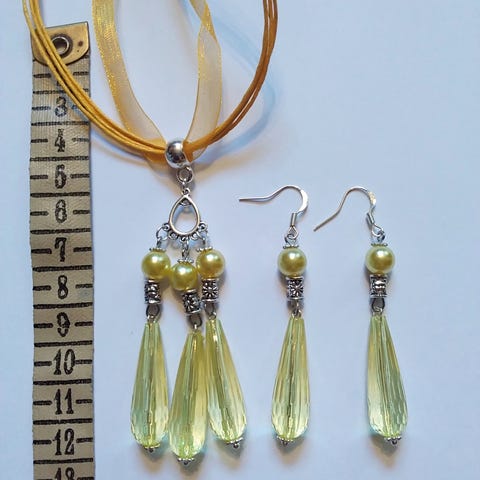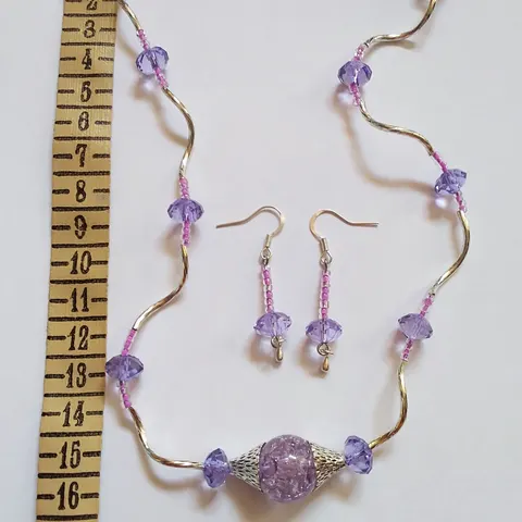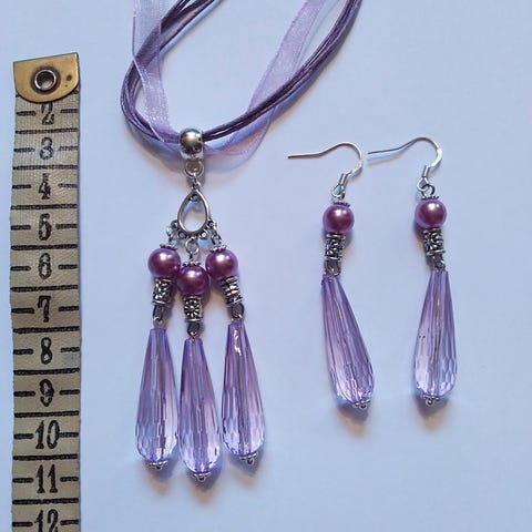 Korusetti , korvakorut ja kaulakoru , akryyli ja hopeoituja helmiä.