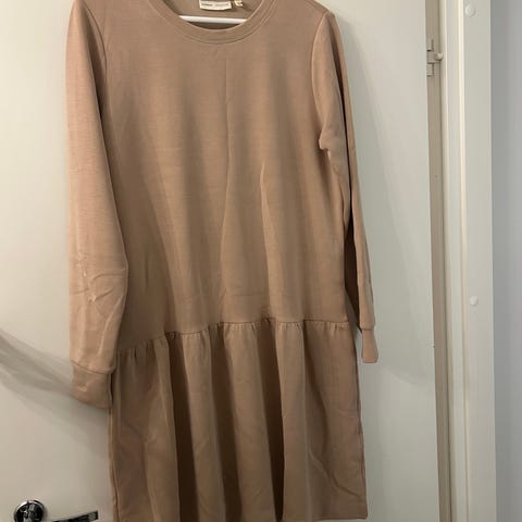 Mekko joustaa neulosta, selkäpuolella niskassa aukko. Kainalo-kainalo n. 43 cm, olka-helma n. 103 cm.