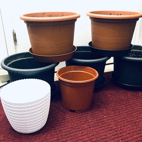 Kuvienmukaiset hyväkuntoiset erikokoiset muoviset kukkaruukut 0,10-1,-/kpl. Suurimmat mustat ruukut noin 7-10L.