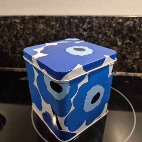 Myydään käyttämätön, vitriinissä säilytetty Marimekon peltipurkki. Koko 11x11x17,5 cm.