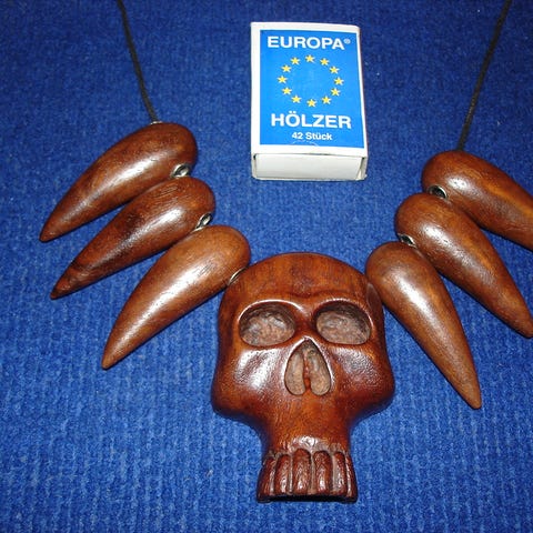 Afrikkalaisesta eeben-puusta käsityönä valmistettu kaulakoru. Erittäin kovaa, tiivistä ja kestävää mustaa puuta, ei värjätty, ainoastaan kirkasvahattu. Mitat kallolla kork 9cm, leveys 6,5cm. Metallihelat läpivienneissä.
