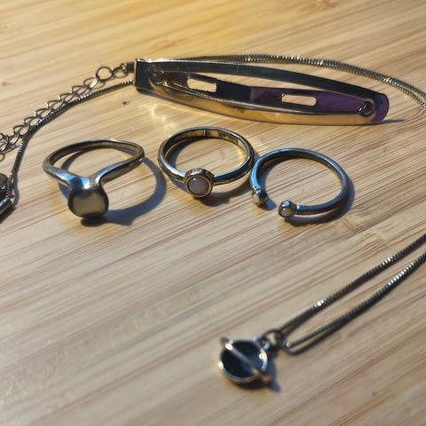 Neljä käsikorua ja kaksi sormusta. Hyvässä kunnossa.
