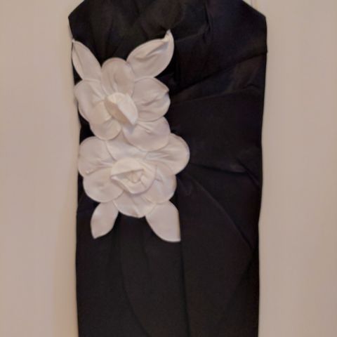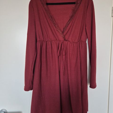 Kaunis, ihanan punainen mekko, jossa kuvioina mustia pieniä kirsikoita.