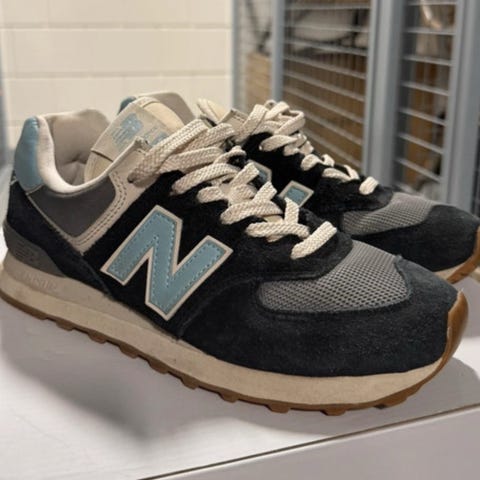 Erittäin hyväkuntoiset naisten New Balance 574 tennarit kokoa 39,5. Sisämitta 24,5 cm. Kengät ovat väriltään valkoiset, joissa vihreitä yksityiskohtia. Siistikuntoiset, mutta molempien kenkien sisäsyrjien kohdalla on kulumaa. Erittäin mukavat jalassa.