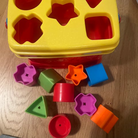 Hyväkuntoinen palikkalelu, missä nuo palikat siis pujotellaan noihin keppeihin.