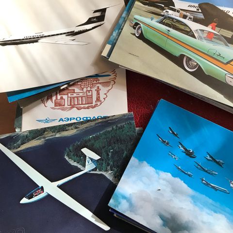 Postikortti, jossa on valokuva Helsinki-Vantaan lentoasemasta. Kuvassa näkyy lentokoneita kiitotiellä ja useita autoja parkkipaikalla. Kortti on värillinen, esittää lentoaseman aluetta ilmakuvassa.
