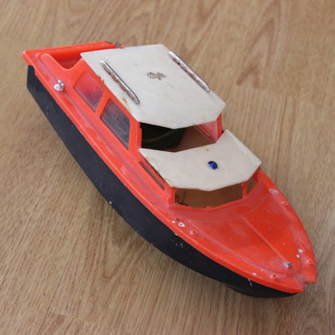 Kuvienlainen veneen pienoismalli.Pituus 40cm ja leveys 13cm.Kuten kuvasta näkyy niin laitojen päätypinnat irronneet liimauksista.Nouto Muuruvedeltä.