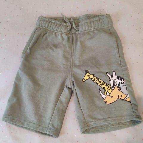 H&M shortsiyöpuku koossa 98. Valkoinen dinokuvio ja vihreä. Vetoketju.