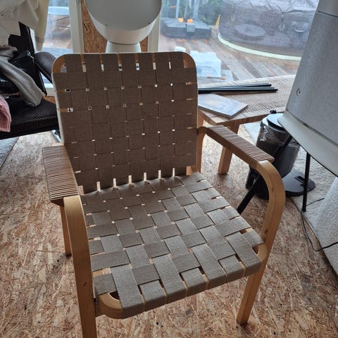 Erittäin hyväkuntoinen satulavyötuoli. Ollut vierashuoneessa vähällä käytöllä. Pellavan väriset vyöt. En löydä moitittavaa .
