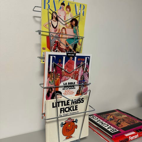 Sirot ja kauniit yksityiskohdat, värjättyä metallia ja puureunukset. 6 paikkaa lehdille ja kirjoille.