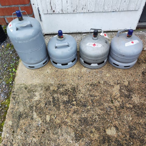 Metallinen kaasupullo harmaalla pinnalla. Pullo on käytetty ja siinä on näkyvää ruostetta. Soveltuu kaasun säilytykseen ja kuljetukseen.