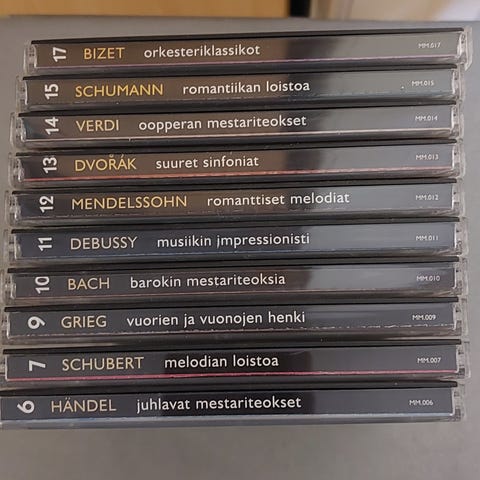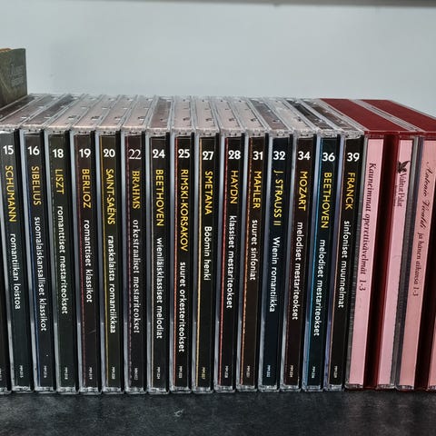 Tässä erittäin hyvä ja monipuolinen sarja klassisen musiikin harrastajalle. Myydään musiikin mestarit klassinen musiikki cd levy sarja 1- 40 mutta on 38 levyä koska numerot 24 ja 25 puuttuu. Eli yht 38 cd levyä hinta 20 e