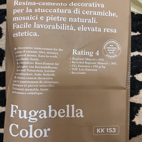 Fugabella Color 45 kerakoll saumauslaasti, kaksi kappaletta 3 kg:n säkkiä. Hinta 15 e/ säkki. Käyttö esim. kylpyhuoneen laattojen saumaamiseen ja korjaamiseen. Väri nro 45.