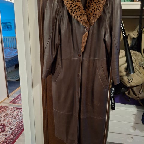 Lähes käyttämätön, originelli Kestilän lampaannahkatakki, jossa turkissomisteet hupussa, hihoissa ja vyössä.