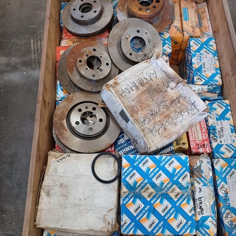 Sekalainen valikoima vanhojen autojen lähinnä 70-80-90 luvun autojen jarrupaloja, käyttämättömia. Myydään koko lavallinen kerrallaan. Lavasta on olemassa listaus josta näkee suurin piirtein mitä lavassa on, sen saa pyytämällä, on PDF muotoisena.