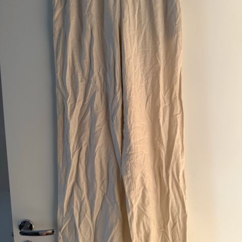 Käyttämättömät, upeat housut syksyyn! Minulla on housuja vastaava jakkutakki ja siinä lukee materiaalina: 47% villa, 29% polyamidi, 24% lyocell. Housut on mulle hieman pienet ja siksi myyn. Olen enemmän M/L-kokoa housuista.