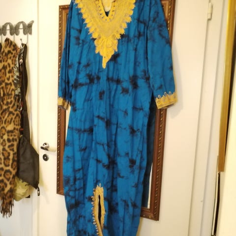 Ulkomailta tuotu vanha kaftaani. Mitat olka-helma n. 145 cm, kainalo-kainalo 64 cm