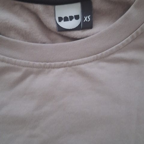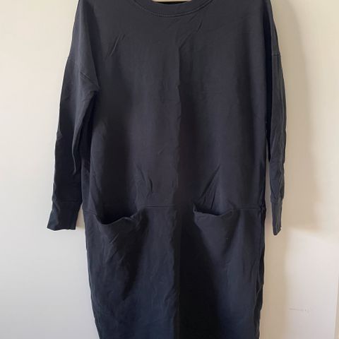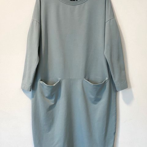 Papu hyväkuntoinen mekko. Materiaali pehmeä luomu collegetrikoo 95 %, 5 % elastan. Edessä poikittaiseen saumaan upotetut taskut. Laskettu hartialinja. Hihat ovat käsivarsia muotoilevat, muuten mekko on malliltaan ns. oversize malli. Koko XL