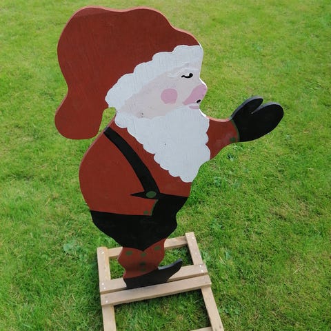 Uniikki vanerinen joulupukki, korkeus on 89cm. Koukkuun saa lyhdyn roikkumaan.