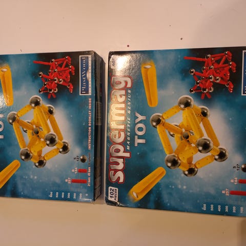 Myydään magneettisarja. Sisältää erikokoisia magneetteja, muovisia ruuvattavia osia sekä erikokoisia teräspalloja väliin. Muutama osa puuttuu alkuperäiskokoonpanoon nähden.