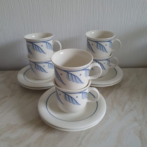 Vaaleansiniset, ehjät, 5 kahvikuppia, 7 asettia ja kermanekka. Kaikki yhteensä 10 euroa.