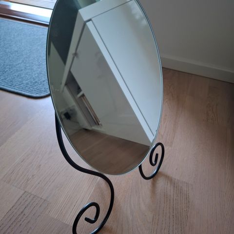 H&M Home silmän muotoinen pöytäpeili, jossa metallikehys ja jalusta, kullan värinen. Sopii sisustuselementiksi pöydälle tai hyllylle.
