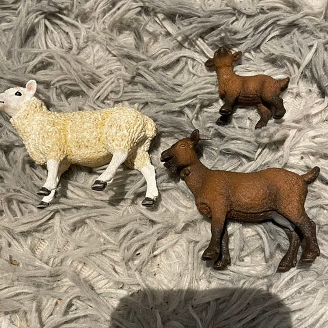 Sonni ja sika 4€/kpl, kukko, kana, tiput ja pupu 2,5€/kpl. Kaikki kerralla 15 €. Karitsan ja possun saa mukaan, eivät ole schleichin.