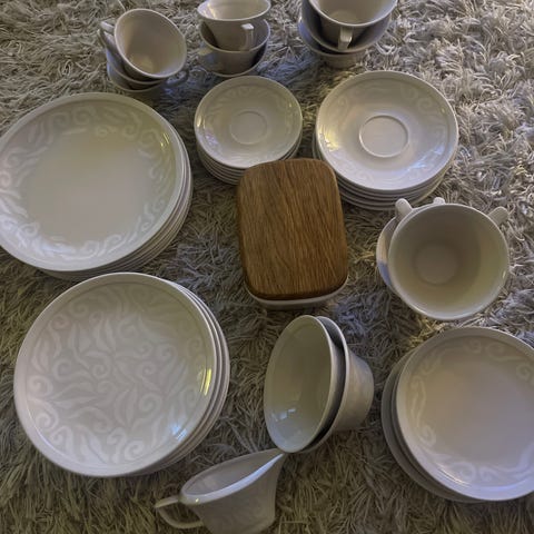 Erinomaisessa kunnossa olevat kahvikupit, tassit, pullalautaset, tarjoiluastiat, kynttiläjalat jne. Myydään kaikki yhdessä.