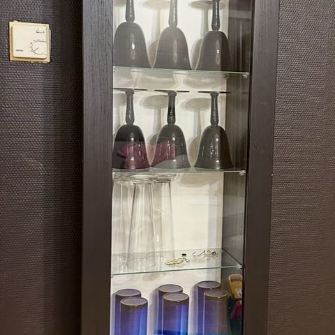 Hyväkuntoinen, valkoinen, lasivitriinihyllykko ja laatikosto. Lasivitriinissä toimiva valo