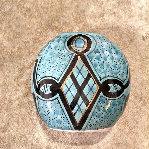 Koristeellinen sininen posliinimaljakko ja purkki kultakoristein