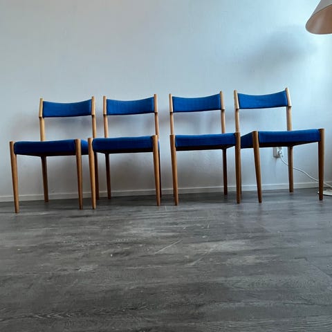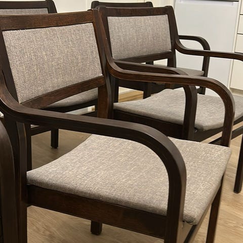 Askon käsinojallinen tuolipari v. 1937. Kuuluu ruokailuhuoneen kalustosarjaan "Lahja nro 282". Tukevat tuolit perushyvässä kunnossa. Istuimet päällystetty myöhemmin keinonahalla, alkuperäinen tekstiili mahdollisesti vielä päällysten alla.