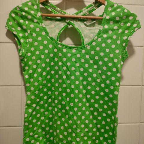 Vaalean vihreä Marimekon toppi Mika Piirainen. Kokolapussa lukee L, mutta menee myös M kokoiselle. Siisti joskin hieman ryppyinen kun on kaapissa ollut. Jossain piti olla olevinaan pieni nuppineulan pään kokoinen rasvatahra kankaassa mutta ei osunut kuvatessa silmään.
