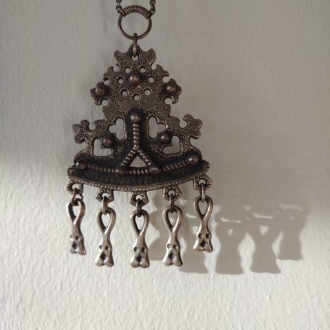 Kaunis, massiivinen riipus. Valmistettu Suomessa. Kalevala? Pronssia? Takana on teksti Finland ROS. Korkeus on 4 senttimetriä, leveys 2,7 senttimetriä. Riipus oli kulunut, kunto oli sukassa.