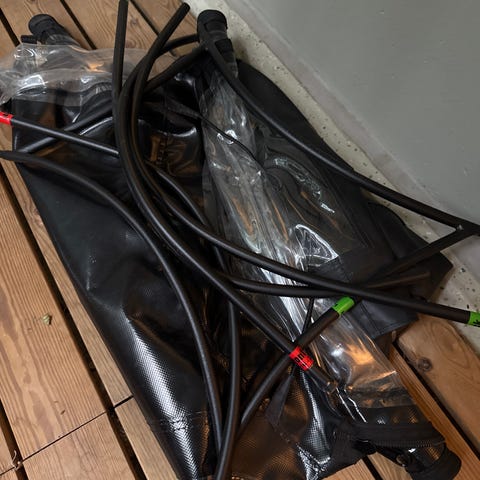 Sadesuoja, hyvä suoja ei lapset kastu. Yksi kohta paikattu paikka-aineella. Vetoketjut ei toimi niinkuin pitää..mutta saa laitettua sillai että ei vettä tule laatikkoon sisään. Tästä edullisesti suoja, ajaa asiansa. Ja jos hinta ei miellytä saa ehdottaa mitä tästä haluaa. Nouto tai postitus päälle.