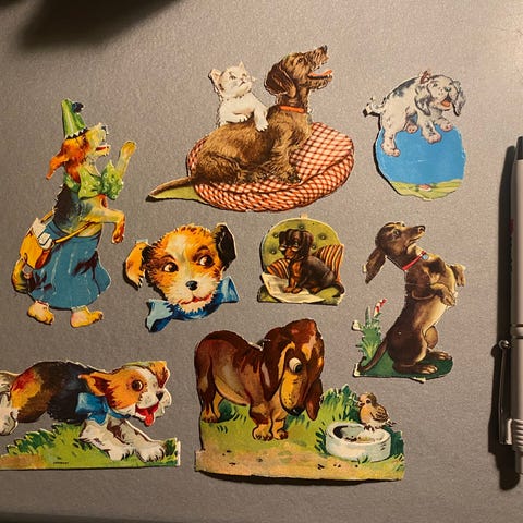Yhteensä 11 erilaista kiiltokuvaa. Kaupanpäälle lähetän vielä kaksi koiran kuvaa; toisessa on kulmassa taite, toisessa jalat olleet taittuneina– en raaski heittää pois, joten saat kaupanpäälle – jos et halua niin ilmoita. Nämä ovat kuvissa mukana.