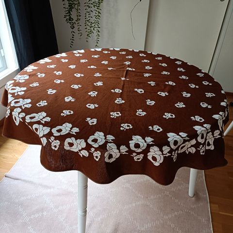 Puuvillaisen pöytäliinan halkaisija on 175 cm. Se on Finlaysonin tuotantoa 1980-luvulta.