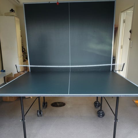 Donic merkkinen pingis pöytä joka taittuu kasaan ja renkaat löytyy että on helppo liikutella. Pituus 274cm ja leveys 153cm. Mukaan saa pingis mailoja ja palloja ja tietysti verkon