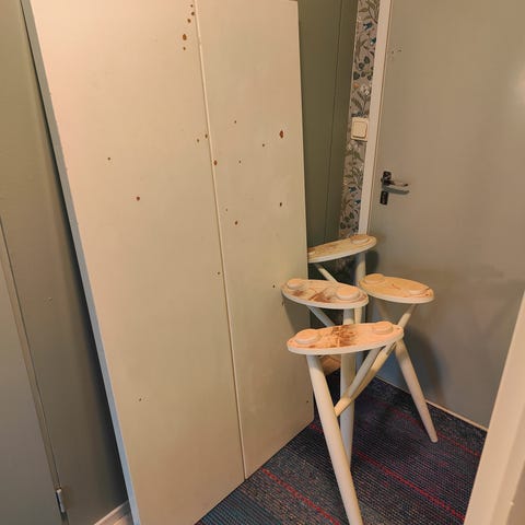 Kolme ehyttä tuolia. Lisäksi annetaan mukaan yksi tuoli, jonka jalka poikki.
