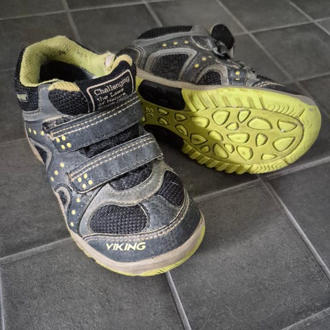 Vikingin siniset välikausilenkkarit koossa 26 suoraan käytöstä. Muuten hyväkuntoiset, mutta vasemmasta kengästä näkee, että sillä on jarruteltu potkupyöräillessä.