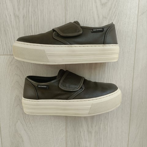 Marimekon kultaiset Marka nahkatennarit tarrakiinnityksellä. Ihanat, harmillisesti jääneet itselle pieneksi. Kulumaa on, mutta edelleen käyttökunnossa.