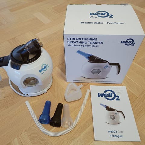 Vähälle käytölle jäänyt Wello2 hengityslaite. Sisältää muut osat paitsi silikonisen nenämaskin.