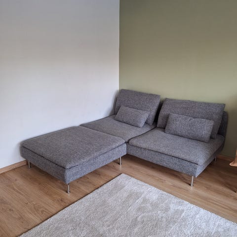 Laadukas Maskusta ostettu sohva.Noin 8 vuotta vanha. Tyynyistä saa päälliset irrotettua pesua varten. Koira koti.