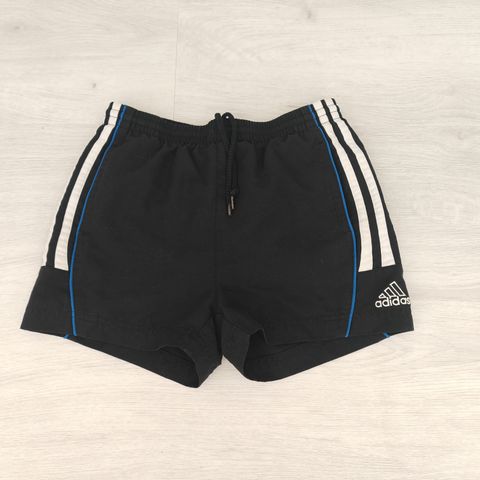 Mustat poikien Adidas uimashortsit, joiden etupuolen pinnassa hieman maalitahraa.