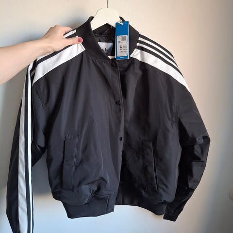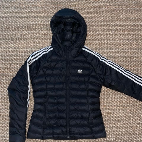 Lämmin musta Adidaksen toppatakki koossa M. Naisten malli. Hupussa kiristysnyörit. Molemmilla puolilla vetoketjutaskut