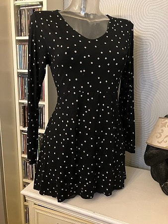 Uutta kotia etsii kuvan upea laskeutuvaa polyesteriä oleva musta coctail mekko / bilemekko upealla kultaisella yksityiskohdalla/ koristesoljella vyötäröllä