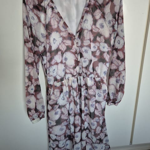 Mangon mekko, joustavan puuvellasekoitteen kaltainen kangas, lappu puuttuu. Kokolapussa M, mutta vastaa mielestäni S. Makea violetti leopardikuosi.