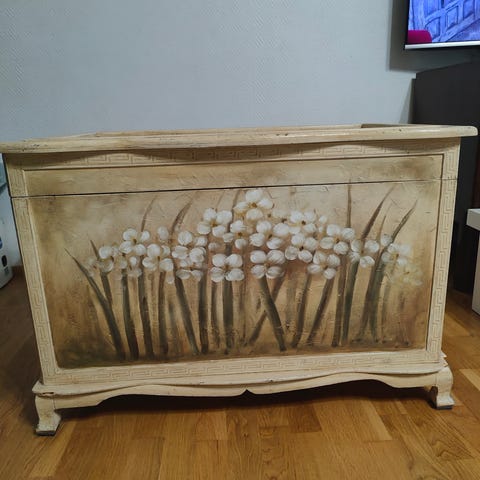 Ostetaan massiivipuinen lipasto, pieni senkki tai kaappi. Pitäisi olla ovet tai laatikot, että saa tavarat nätisti piiloon.
