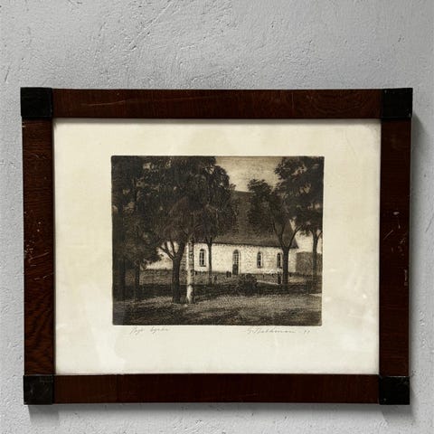 Backmanin Ekenäs grafiikka vuodelta 1915. Kuvassa Tammisaaren kirkko. Kuva-ala 16 x 21 cm. Nouto Herttoniemestä tai postitus.