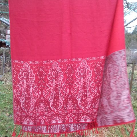 Sinipohjainen, kuviot punainen- musta-ruskea (tai beige)-sinisen eri sävyt. 120 x 120 cm. Paisley /Kashmir kuviointi.
