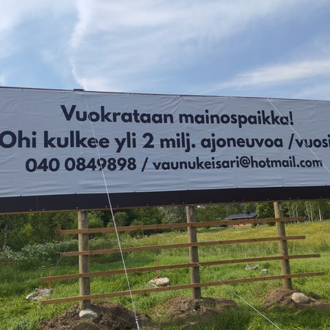 KT65,noin.6km ennen elovainiota.Ohi kulkee yli 2.1 milj ajoneuvoa vuodessa,eli n.6000 vuorokaudessa!! Myös valot löytyy.Voin kiinnittää mainoslakanan samaan hintaan.Myös lyhyemmät ajat onnistuu.350 ekee kuukausi